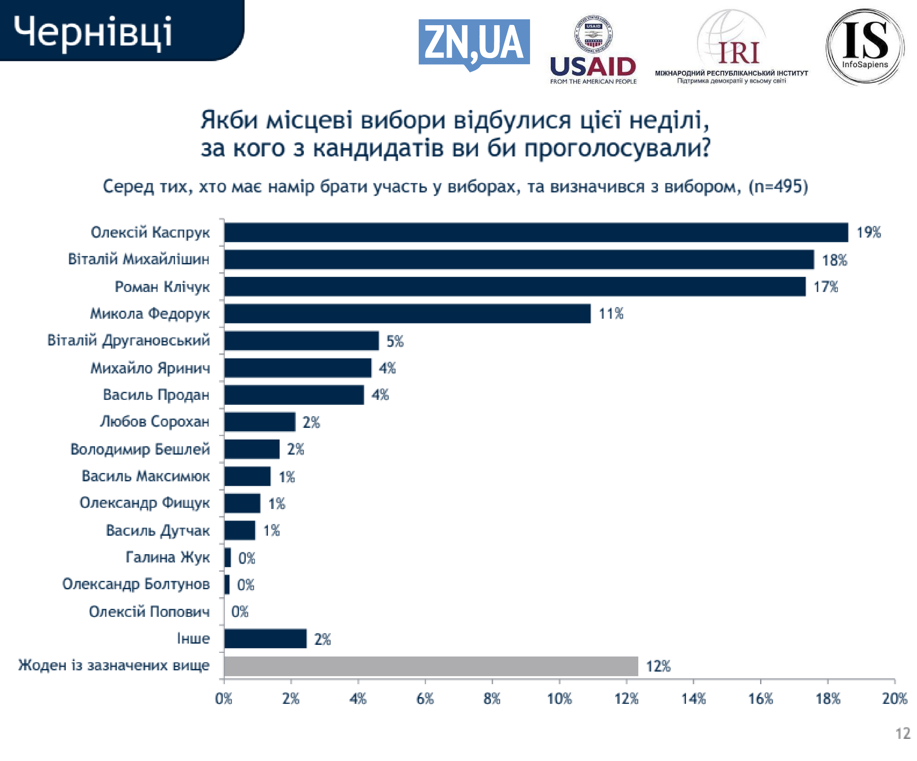 По 4% рейтинга имеют Михаил Яринич и Василий Продан, по 2% – Владимир Бешлей и Любовь Сорохан. Мэрский рейтинг в 1% у Василия Максимюка («Европейская солидарность»), Александра Фищука и Василия Дутчака.