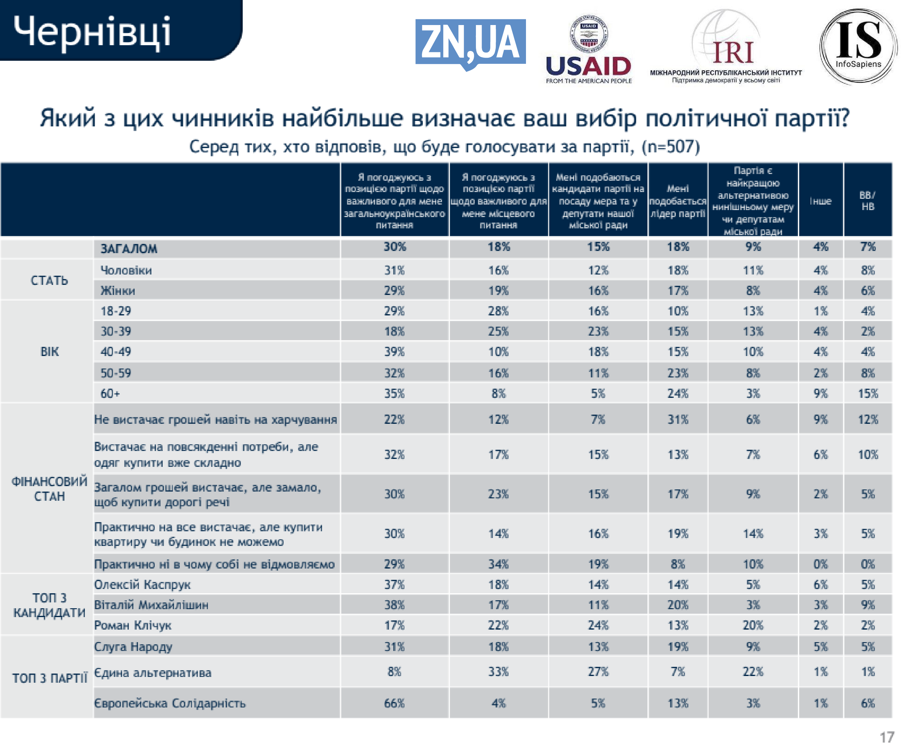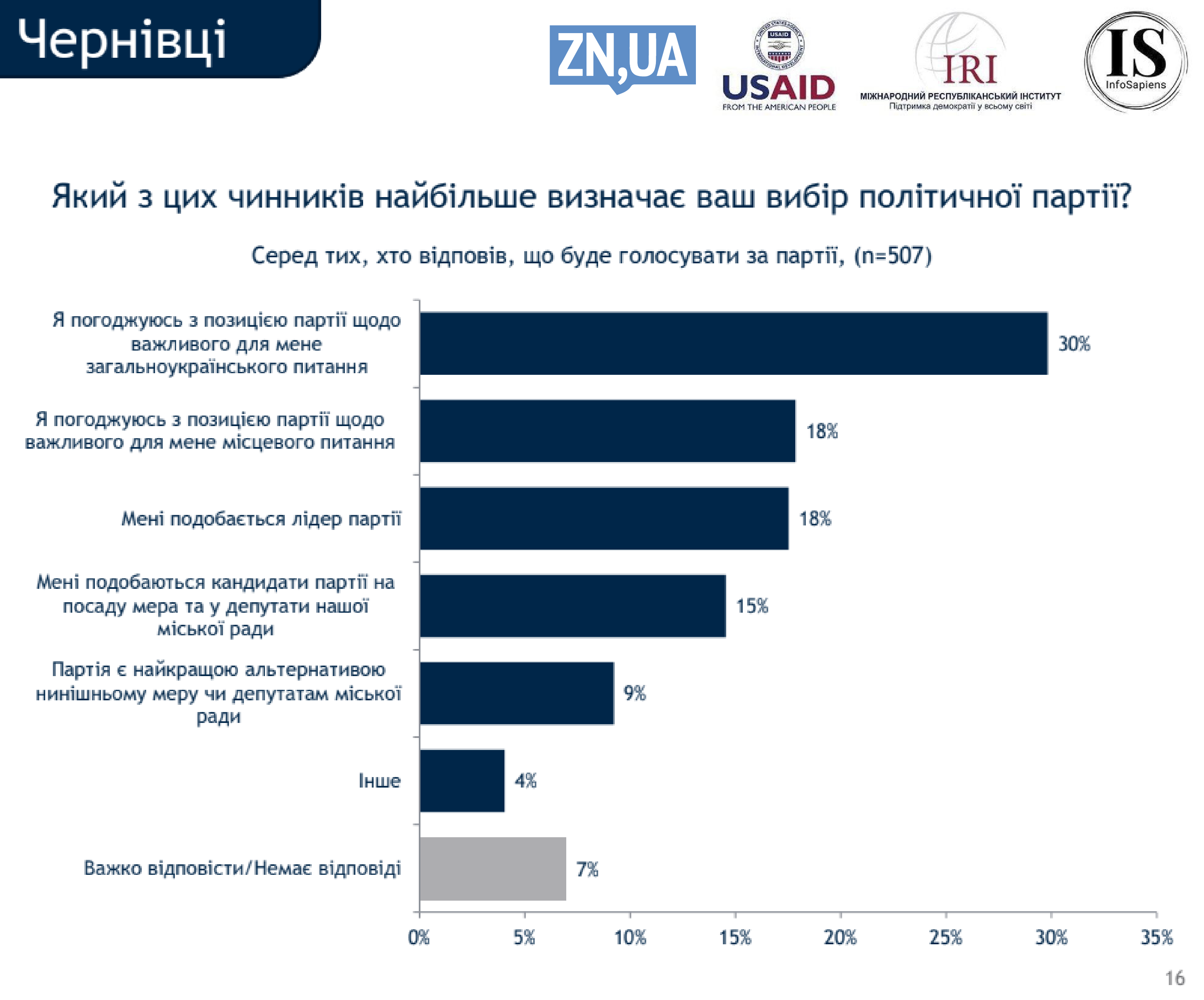 Среди мотивов, которыми руководствуются жители Черновцов, выбирая ту или иную партию, на первых местах – совпадение во взглядах по какому-то важному общенациональному (30%) и местному (18%) вопросам.