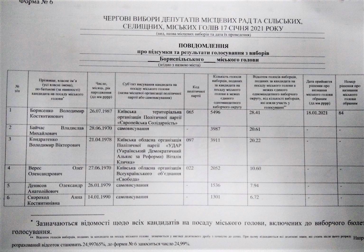 «По данным Бориспольской городской территориальной избирательной комиссии, он получил 28,42% голосов, более чем на полторы тысячи голосов опередив провластного кандидата, которого поддерживала коалиция «Слуги народа», ОПЗЖ и «Батькивщины»», - говорится в сообщении пресс-службы политсилы.
