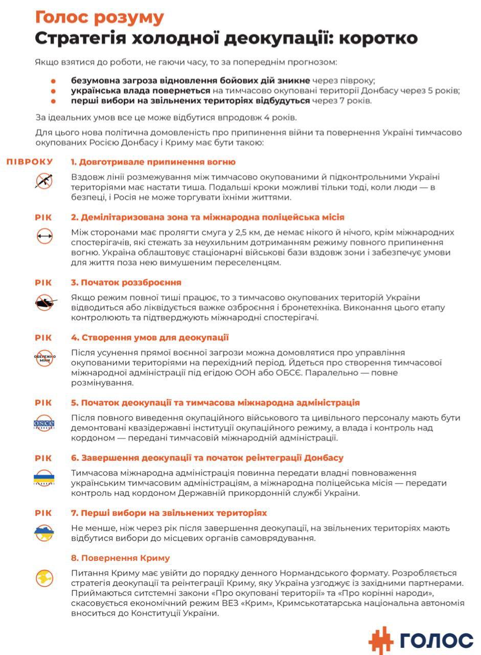 Безусловная угроза возобновления боевых действий может исчезнуть за полгода, украинская власть может вернуться на временно оккупированные территории Донбасса через пять лет, а первые выборы на освобожденных территорий могут состояться через семь лет. Об этом говорится в Стратегии холодной деоккупации партии "Голос".