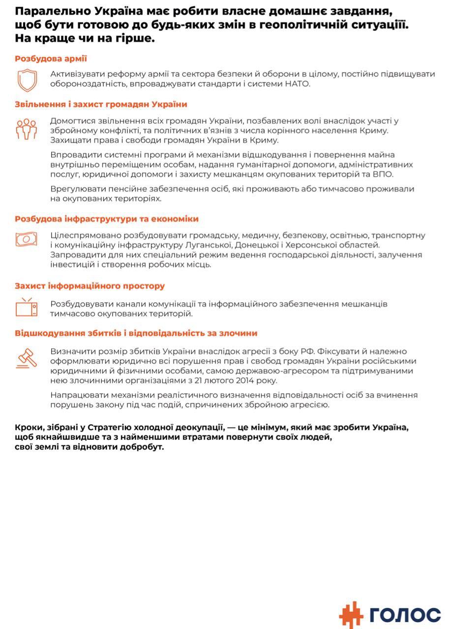"Шаги, собранные в Стратегию холодной деоккупации, - это минимум, который должна сделать Украина, чтобы как можно быстрее и с наименьшими потерями вернуть своих людей, свои земли и восстановить благополучие", - говорится в тексте.