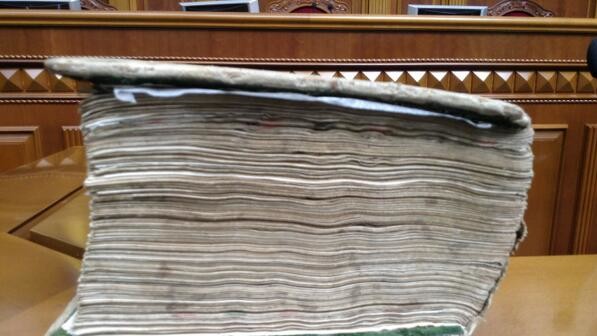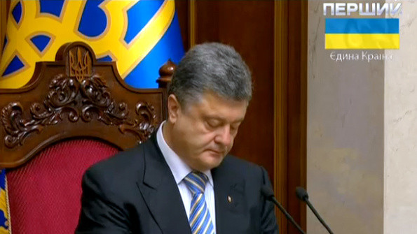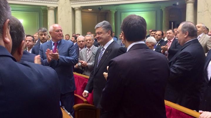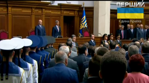 В сессионный зал внесли штандарт, после этого Порошенко на президентском кресле в парламенте скрепил текст присяги своей подписью.