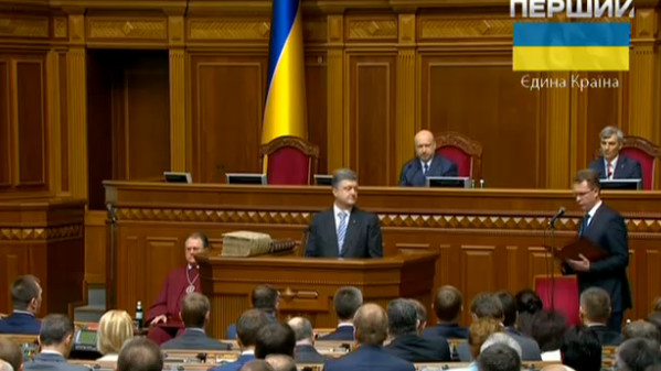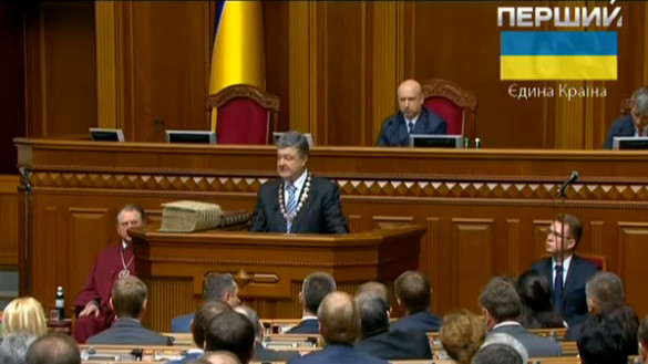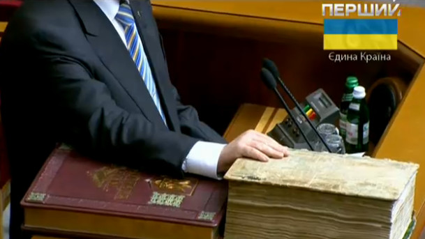 Порошенко принял присягу на торжественном заседании Верховной Рады Украины в субботу на Конституции и Пересопницком Евангелии 16 века.