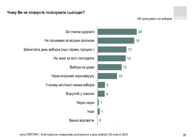 Каждый пятый из тех избирателей, которые не принимали участие в местных выборах 25 октября, сослались на проблемы со здоровьем.. Об этом свидетельствуют данные опроса социологической группы «Рейтинг».