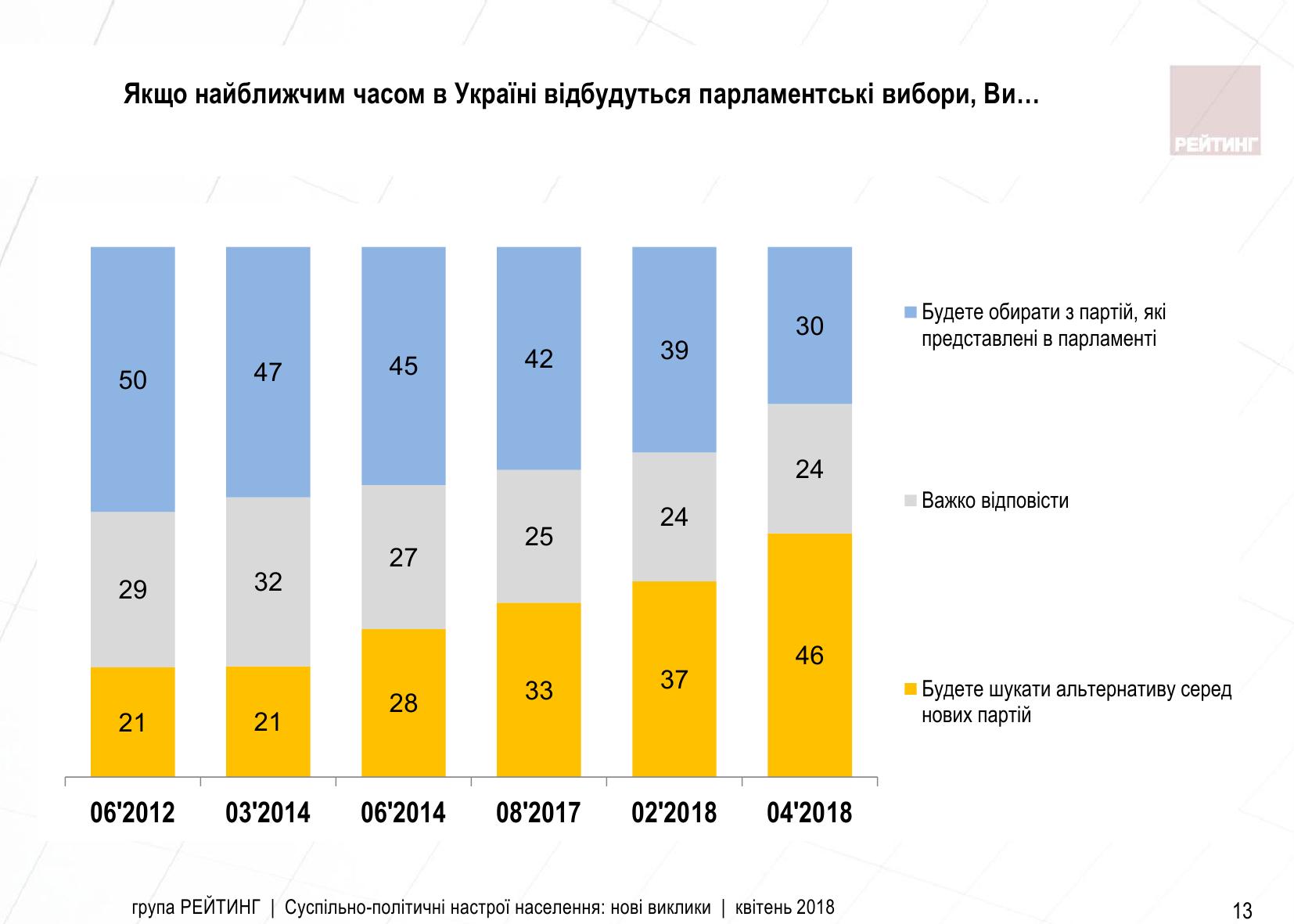 В апреле 2018 года 46% украинцев выражают готовность поддержать новые политические проекты и только треть (30%) голосовали бы за парламентские партии, свидетельствуют данные опроса Социологической группы "Рейтинг".