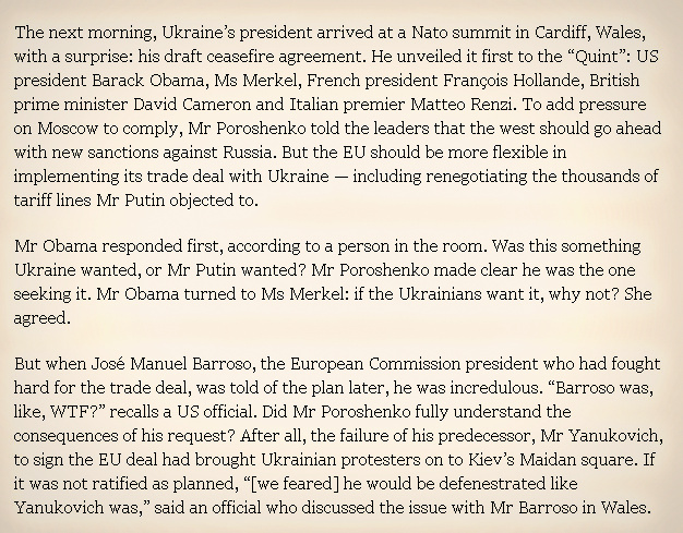 Однако такой поворот событий не устроил Баррозу, который активно боролся за заключение экономического соглашения. "Реакция Баррозу была примерно такая: какого черта?", - вспоминает американский чиновник. Ведь именно отказ Януковича подписать соглашение привел к протестам на Майдане. Если оно не будет заключено, как планировалось, "(мы боялись), что его (Порошенко) вышвырнут, как Януковича", говорит чиновник, обсуждавший с Баррозу этот вопрос в Уэльсе.