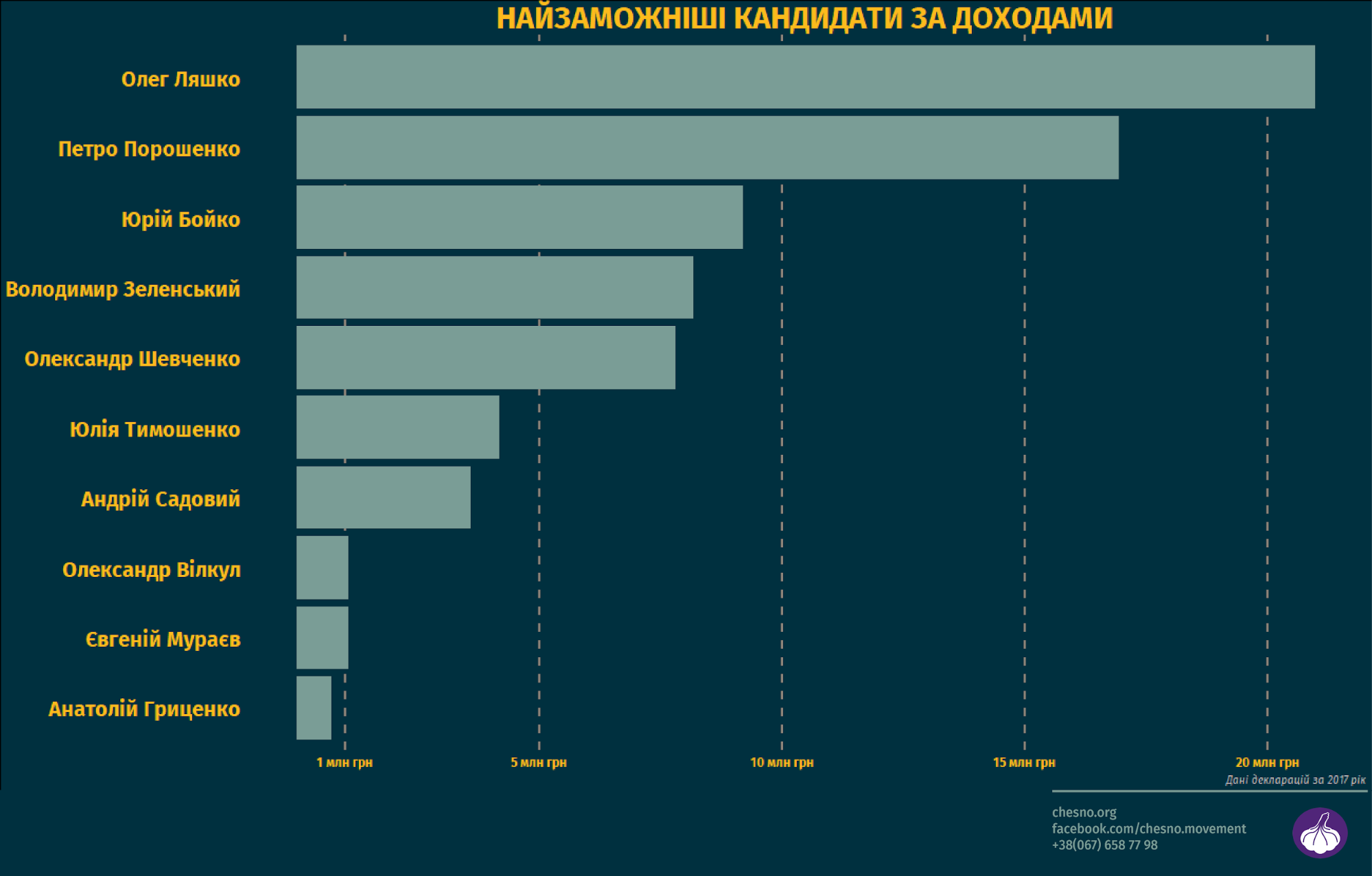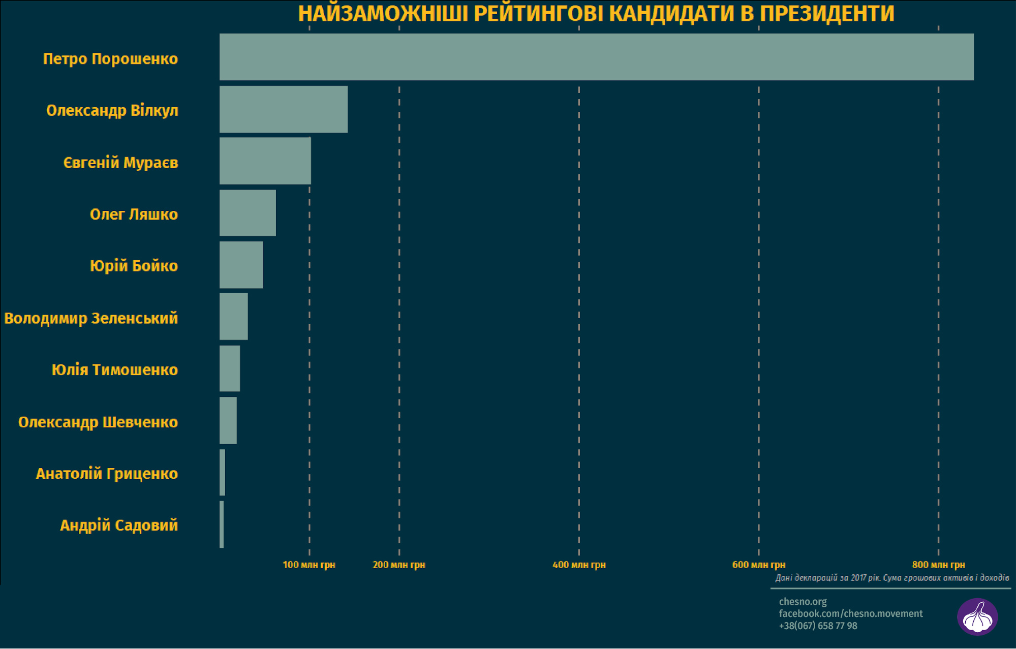Среди кандидатов в президенты на выборах 31 марта по итогам 2017 года самым богатым с довольно значительным отрывом является действующий Президент Петр Порошенко, который имеет около 839 млн грн денежных активов и доходов. Правда в позапрошлом году он заработал 16,3 млн гривен и оказался на втором месте после Олега Ляшко по уровню доходов, говорится в исследовании движения "Честно".
