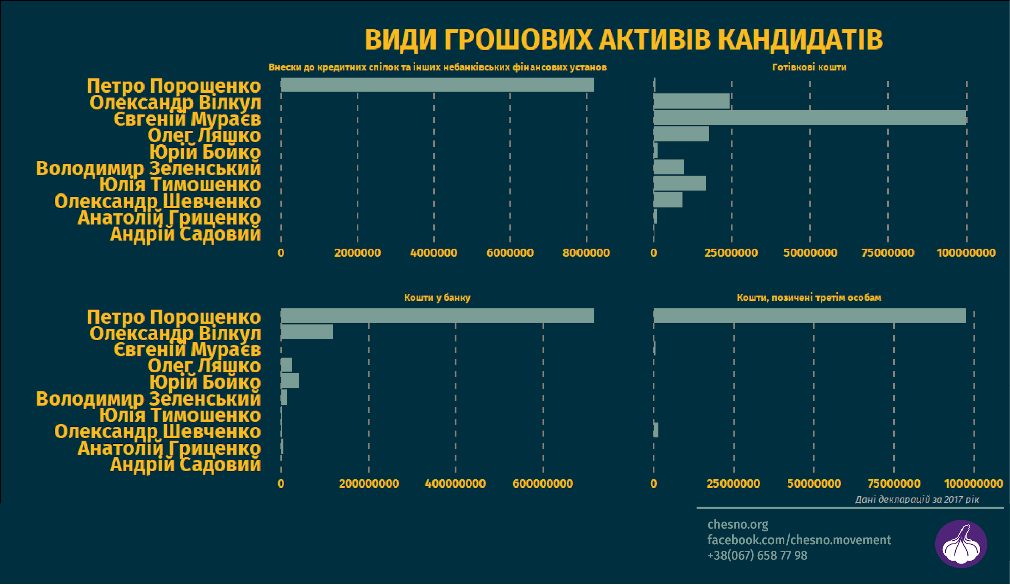 Если взглянуть на структуру денежных активов, то значительная часть кандидатов хранит деньги наличными. Так, Мураев "кэшем" задекларировал около 99 млн грн. Петр Порошенко держит свое состояние в собственном банке – ПАО "Международный инвестиционный банк".