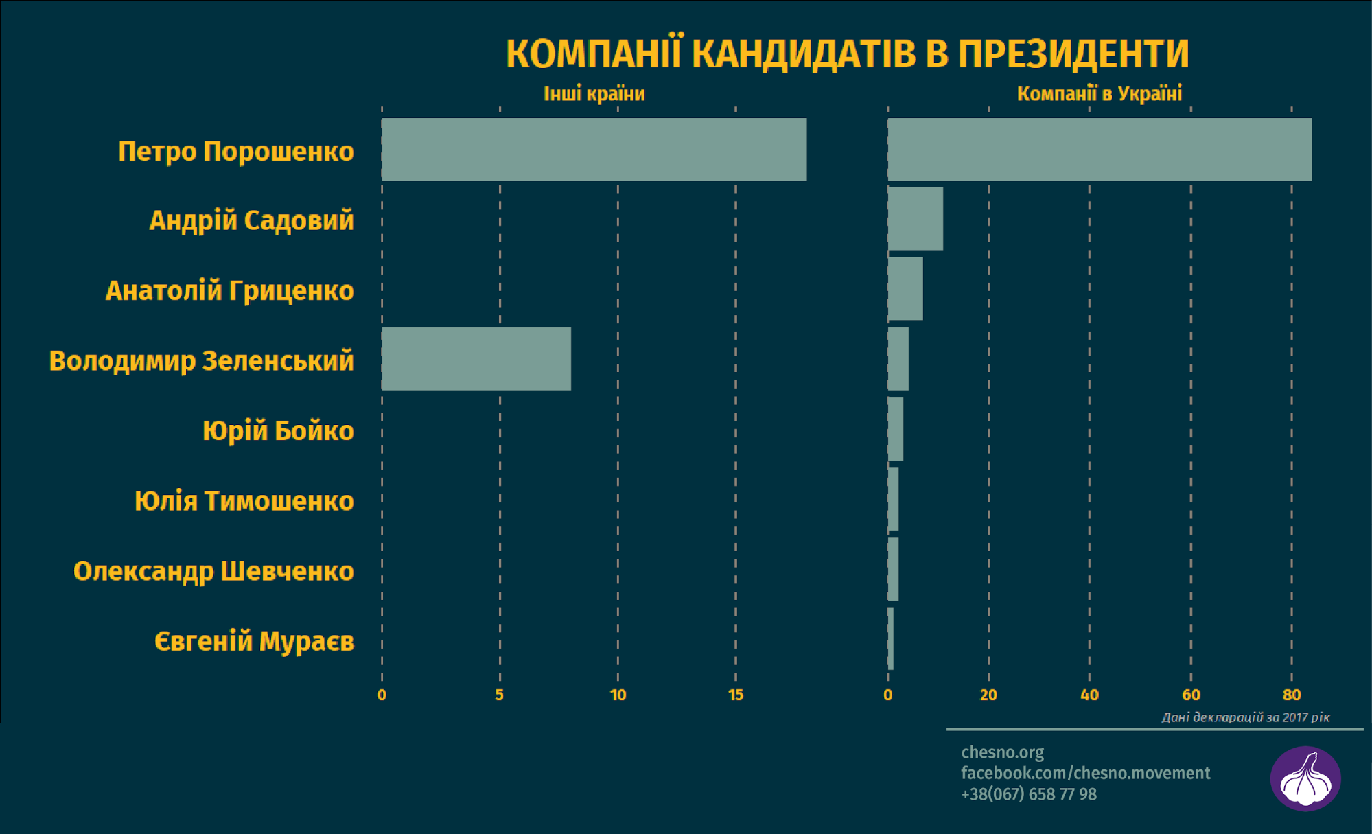 Среди 10 кандидатов фирмы за пределами Украины имеют только Порошенко и Зеленский. У Зеленского есть компании на Кипре, Британских Виргинских Островах, в Италии и Белизе. У Порошенко, кроме Украины, есть предприятия в таких странах, как Казахстан, Кипр, Гибралтар, Грузия, Польша, Британские Виргинские Острова, Литва, Российская Федерация, Беларусь, Нидерланды, Венгрия, Испания, Китай.