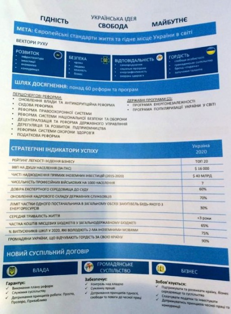"Наши приоритеты: первое – антикоррупционная реформа, обновление власти и бюрократического аппарата. Первое – судебная реформа. Первое – реформа правоохранительных органов. Первое – децентрализация и реформа государственного управления. Первое – налоговая реформа. Первое – дерегуляция и развитие предпринимательства. Первое – реформа системы безопасности и обороны. Это самое актуальное", - сказал он.
