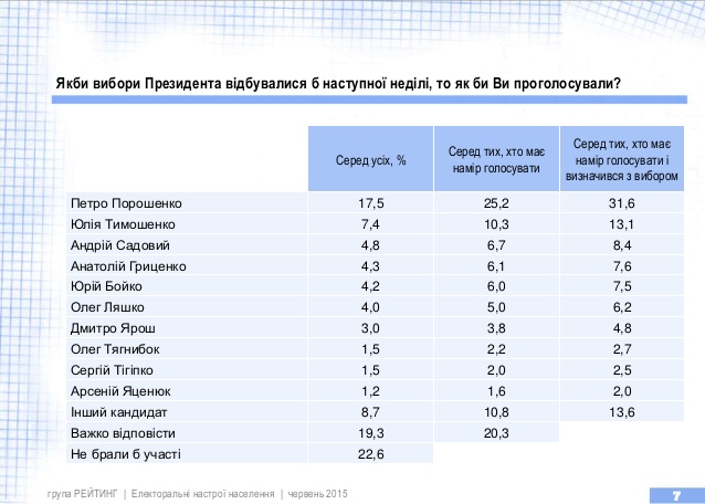 Если бы в следующее воскресенье в Украине проходили президентские выборы, за Петра Порошенко отдали бы свои голоса 31,6% избирателей (среди тех, кто собирается голосовать и определился с выбором), свидетельствуют данные опроса Социологической группы "Рейтинг".