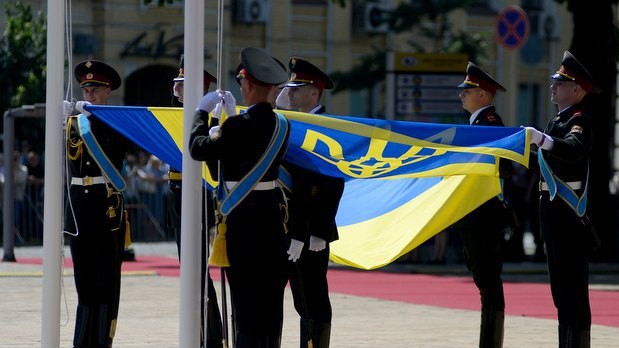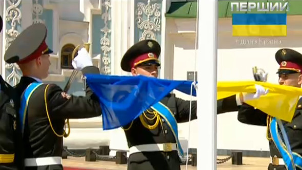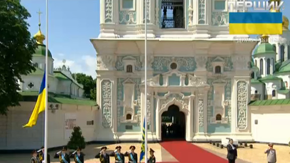 После церемонии поднятия государственного флага Украины и штандарта президента почетный караул прошел перед главой государства торжественным маршем. !zn