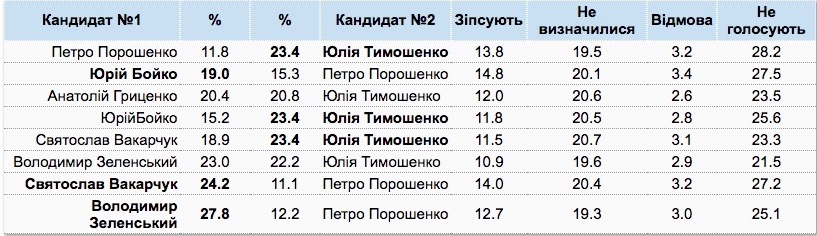 Респондентам во время опроса предложили восемь возможных пар кандидатов во втором туре президентских выборов. Так, Порошенко значительно уступает Тимошенко (11,8% против 23,4%), Зеленскому (12,2% против 27,8%), Святославу Вакарчуку (11,1% против 24,2%) и Бойко (15,3% против 19,0%). В парах Гриценко-Тимошенко и Зеленский-Тимошенко разница в поддержке между обоими кандидатами находится в пределах статистической погрешности.