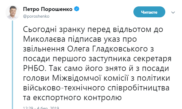 "Сегодня утром перед отлетом в Николаев подписал указ об увольнении Олега Гладковского с должности первого заместителя секретаря СНБО. Так же он снят и с поста председателя Межведомственной комиссии по политике военно-технического сотрудничества и экспортного контроля", - написал Порошенко.