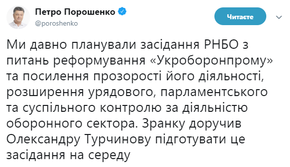 "Мы давно планировали заседание СНБО по вопросам реформирования "Укроборонпрома" и усиления прозрачности его деятельности, расширение правительственного, парламентского и общественного контроля за деятельностью оборонного сектора. Утром поручил Александру Турчинову подготовить это заседание в среду", - написал Порошенко.