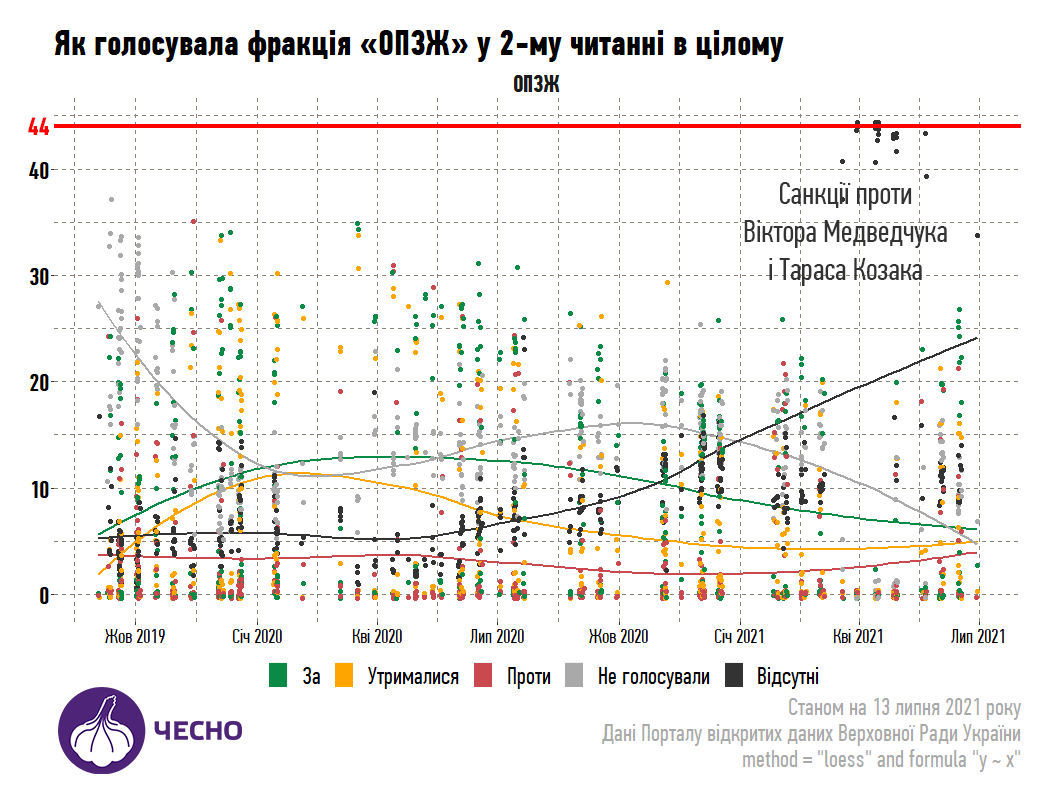 "Рост количества отсутствующих начался еще в октябре 2020 года, но достиг пика в конце марта - в апреле 2021... В апреле во время голосования за ряд законопроектов во втором чтении фракция отсутствовала почти полным составом (44 депутата). Впрочем, потом тренд выровнялся: в июне в среднем лишь 11 депутатов из ОПЗЖ отсутствовали во время голосований", - сообщают активисты.