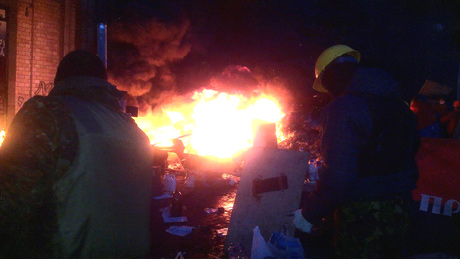 На холме выстроились несколько отрядов ВВ, прикрывшись щитами. Митингующие разбирают мостовую на Майдане, периодически запуская в сторону силовиков фейерверки.