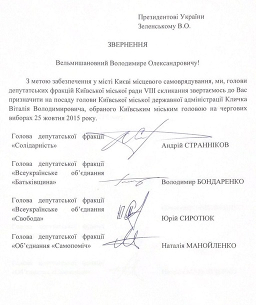 "С целью обеспечения в городе Киеве местного самоуправления, мы, председатели депутатских фракций Киевского городского совета VIII созыва, обращаемся к Вам назначить на должность главы Киевской городской государственной администрации Кличко Виталия Владимировича, избранного Киевским городским головой на очередных выборах 25 октября 2015 г.", - говорится в обращении.
