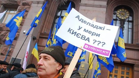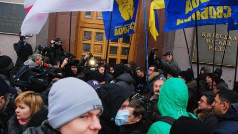 Ранее свободовцы заблокировали центральный и запасные входы в здание Киевской мэрии. Всего здание пикетируют около 500 человек, в связи с чем сотрудники спецподразделения "Беркут" заблокировали вход.