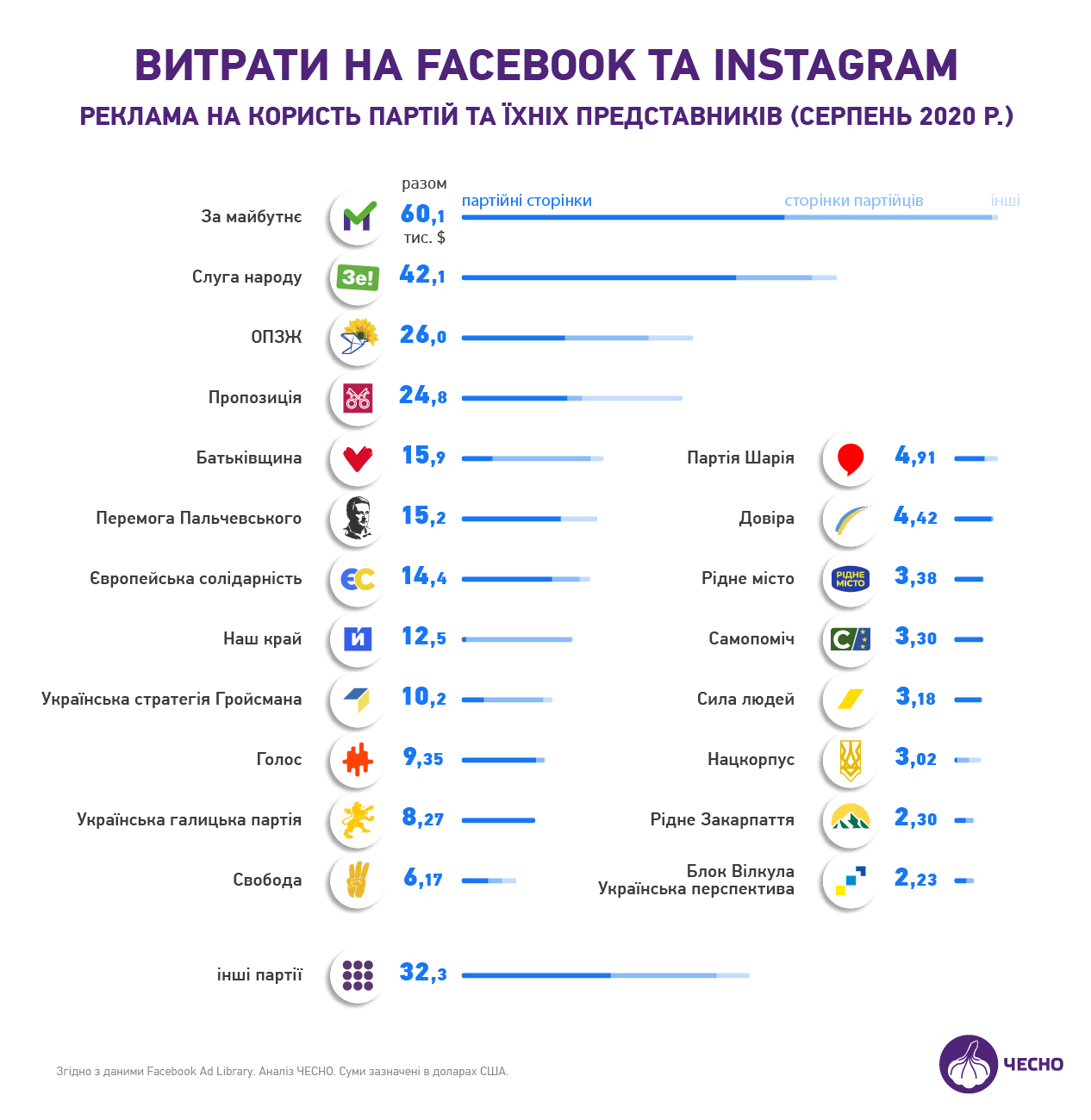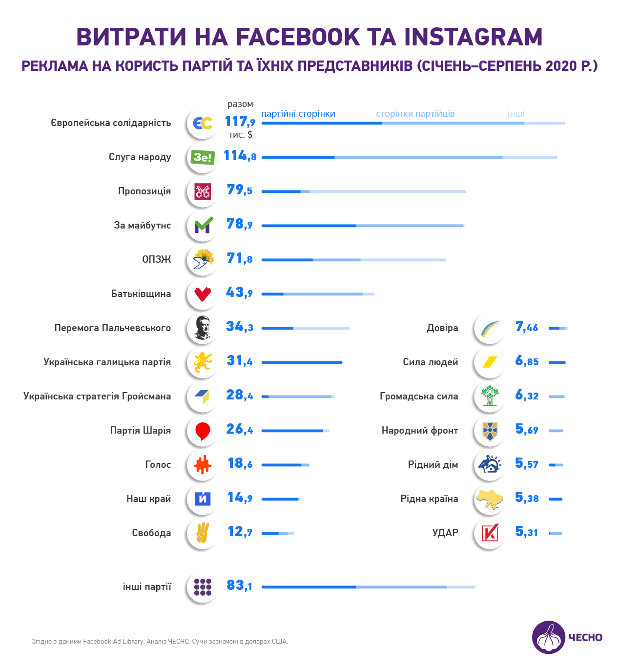 Партийные страницы в августе потратили на рекламу более 173 тысяч долларов, еще 125 тысяч заплатили за рекламу страницы политиков. Это 64% от общих расходов.