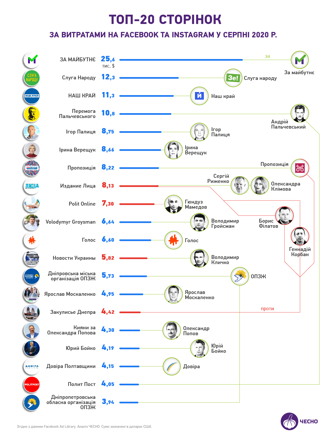Вложились в рекламу кандидаты в мэры Киева Ирина Верещук ("Слуга анарода"), Ярослав Москаленко и Александр Попов. Действующий мэр Виталий Кличко с января по август потратил на рекламу в Facebook 3,4 тысячи долларов. Львиная доля этих денег была уплачена с персональной страницы политика.
