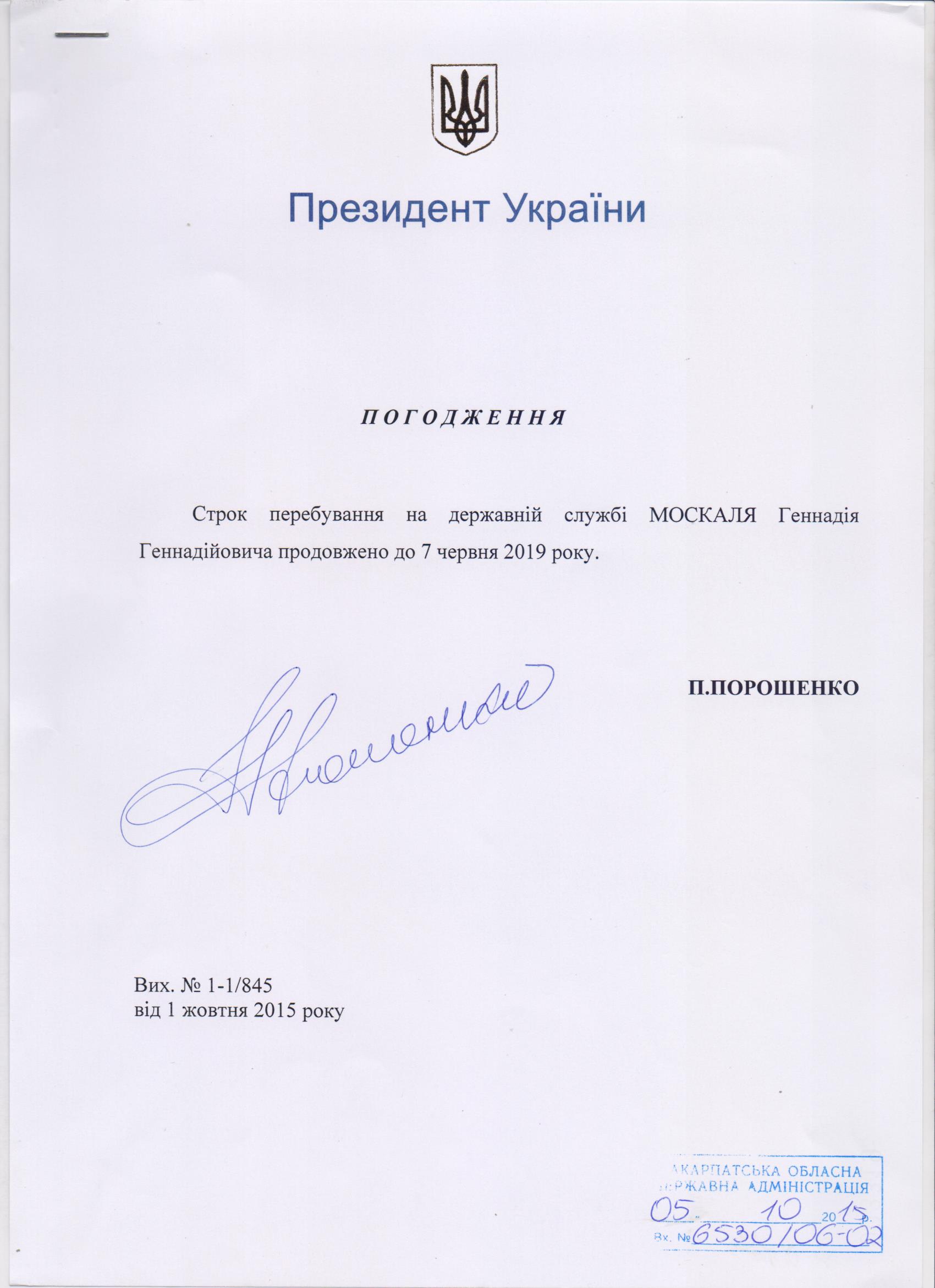 Президент Украины Петр Порошенко согласовал председателю Закарпатской областной государственной администрации Геннадию Москалю, которому в декабре исполнится 65 лет, срок пребывания на государственной службе до 7 июня 2019 года, сообщает пресс-служба Москаля.
