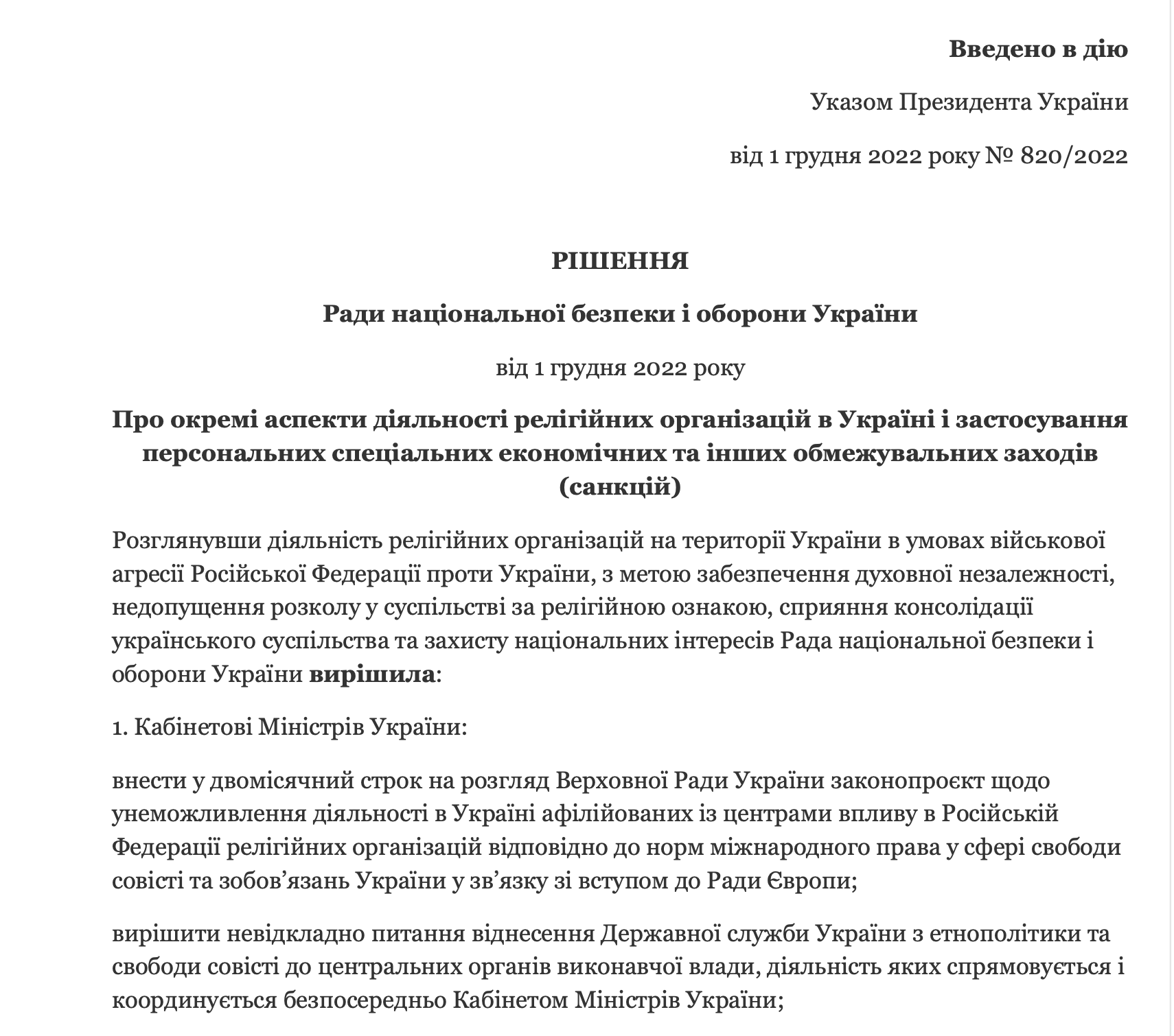 Президент Украины Владимир Зеленский ввел в действие решение СНБО от 1 декабря 2022 года "Об отдельных аспектах деятельности религиозных организаций в Украине и применении персональных специальных экономических и других ограничительных мер (санкций)". Соответствующий указ опубликован на сайте главы государства.