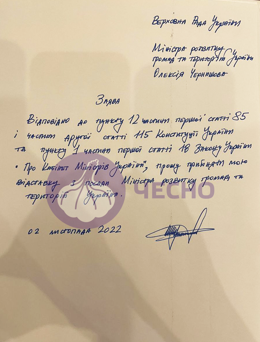 Кроме этого, ЧЕСНО удалось получить фотографию заявления Чернышева, в котором он просит принять свое увольнение с должности. Документ датирован средой, 2 ноября.