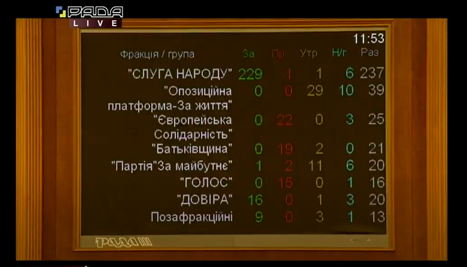 В свою очередь "Слуга народа" отдала 229 голосов "за", ОПЗЖ - 0, "Европейская солидарность" - 0, "Голос" - 0, "Батькивщина" - 0, "За будущее" - 1, "Доверие" - 16, внефракционные депутаты - 9.