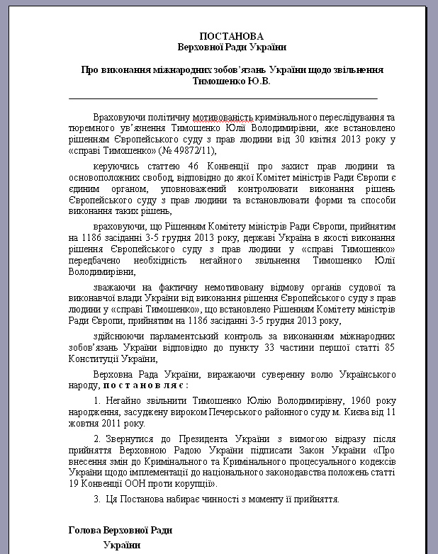 Верховная Рада Украины приняла в целом постановление "О выполнении международных обязательств Украины относительно освобождения Юлии Тимошенко". За соответствующее решение проголосовали 322 народных депутата.