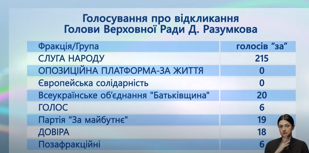 "Если говорить о том, что отставка Разумкова внутреннее фракционное решение, то я хотел бы напомнить, что это манипуляция и результат на табло это показал. Фракция "Слуга народа" не проголосовала в достаточном количестве для того, чтобы отправить меня в отставку. Лишь 215 голосов при необходимых 226. Если бы не поддержка фракции "Батькивщина", двух депутатских групп, то есть мы сегодня можем увидеть фактически новую коалицию в стенах ВР: это "Батькивщина", "Доверие", "Слуга народа" и "За Майбутнє", - отметил Разумков.