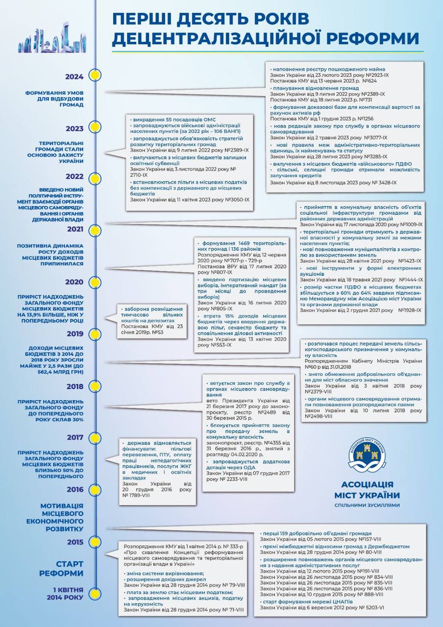 Процесс децентрализации стартовал в 2014 году с принятием Концепции реформы местного самоуправления и территориальной организации власти в Украине, а также законов Украины «О сотрудничестве территориальных громад», «О добровольном объединении территориальных громад» и изменений в Бюджетный и Налоговый кодекс – о финансовой децентрализации. Этот процесс позволил сформировать действенный институт местного самоуправления на базовом уровне – объединенные территориальные громады и сократить число районов, а новые органы местного самоуправления получили соответствующие полномочия и ресурсы, которые ранее имели города областного значения.