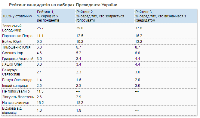 Кроме того, как свидетельствуют данные последнего опроса, 4,4% респондентов, определившихся с кандидатом, отдали бы свой голос за Анатолия Гриценко, 4,4% – за Олега Ляшко, 3% – за Святослава Вакарчука, 2% – за Александра Вилкула. Еще 3,6% проголосовали бы за других кандидатов.