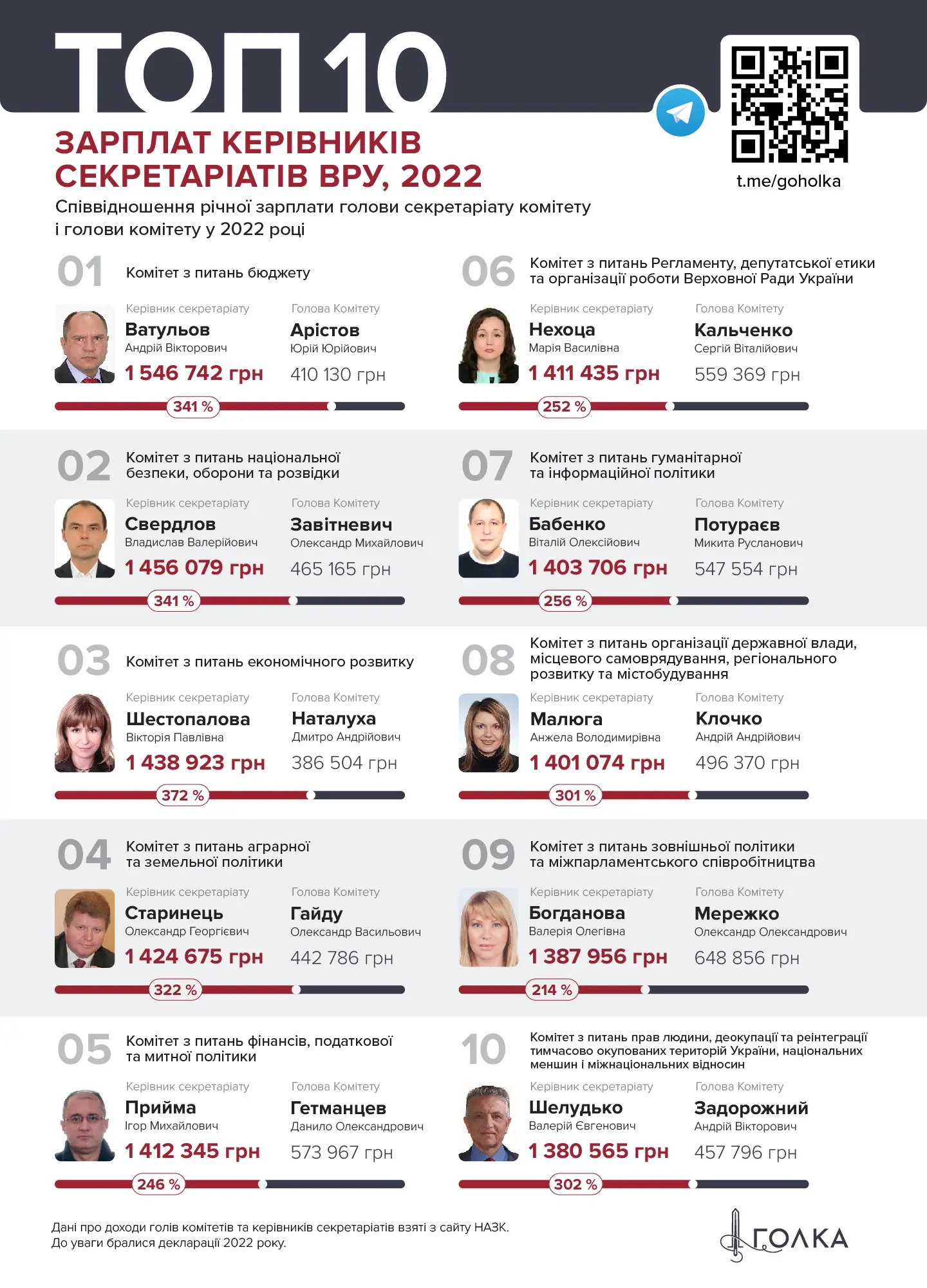 Руководители секретариатов комитетов в 2022 году получали миллионные доходы, в несколько раз превышающие годовой доход глав комитетов, пишет в своем материале для ZN.UA «Путь в никуда: миллионные зарплаты аппарата Верховной Рады и мизерные зарплаты нардепов» журналистка, лидер гражданской инициативы "Голка" Ирина Федоров.