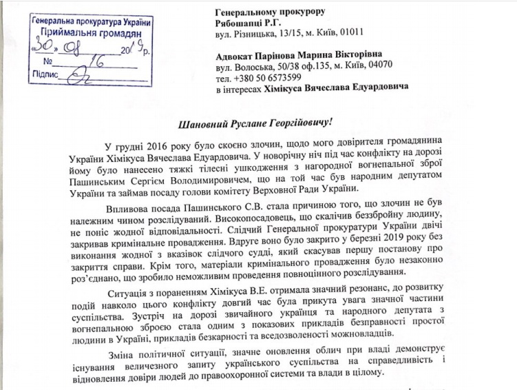 В Генеральную прокуратуру поступило ходатайство об отмене закрытия уголовного производства в отношении бывшего главы парламентского комитета по вопросам национальной безопасности и обороны Сергея Пашинского. Ходатайство, адресованное генпрокурору Руслану Рябошапке, направила адвокат Марина Паринова. Она представляет интересы Вячеслава Химикуса, в которого стрелял экс-депутат. Возможность возобновления дела в отношении Пашинского она мотивировала "изменением политической ситуации".
