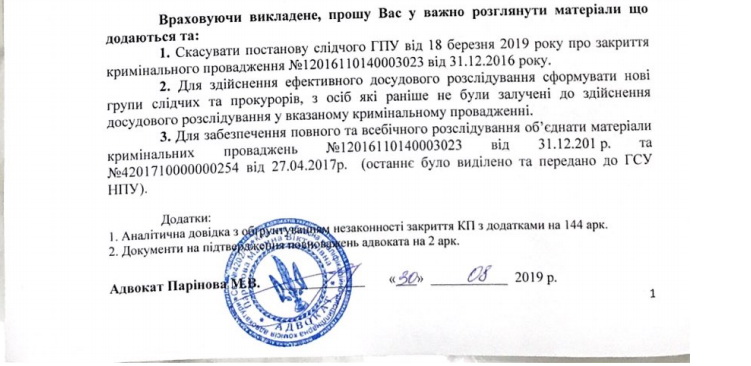 "Изменение политической ситуации, существенное обновление лиц при власти демонстрирует существование огромного запроса украинского общества на справедливость и возобновление доверия людей к правоохранительной системе в целом", - говорится в документе, фотокопию которого опубликовало издание "Обозреватель" вечером в субботу, 31 августа.