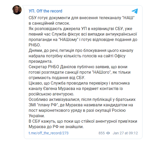 Кроме телеканала, Служба проверяла и его владельца, но стойкую агентурную привязку Мураева к России «не нашла».