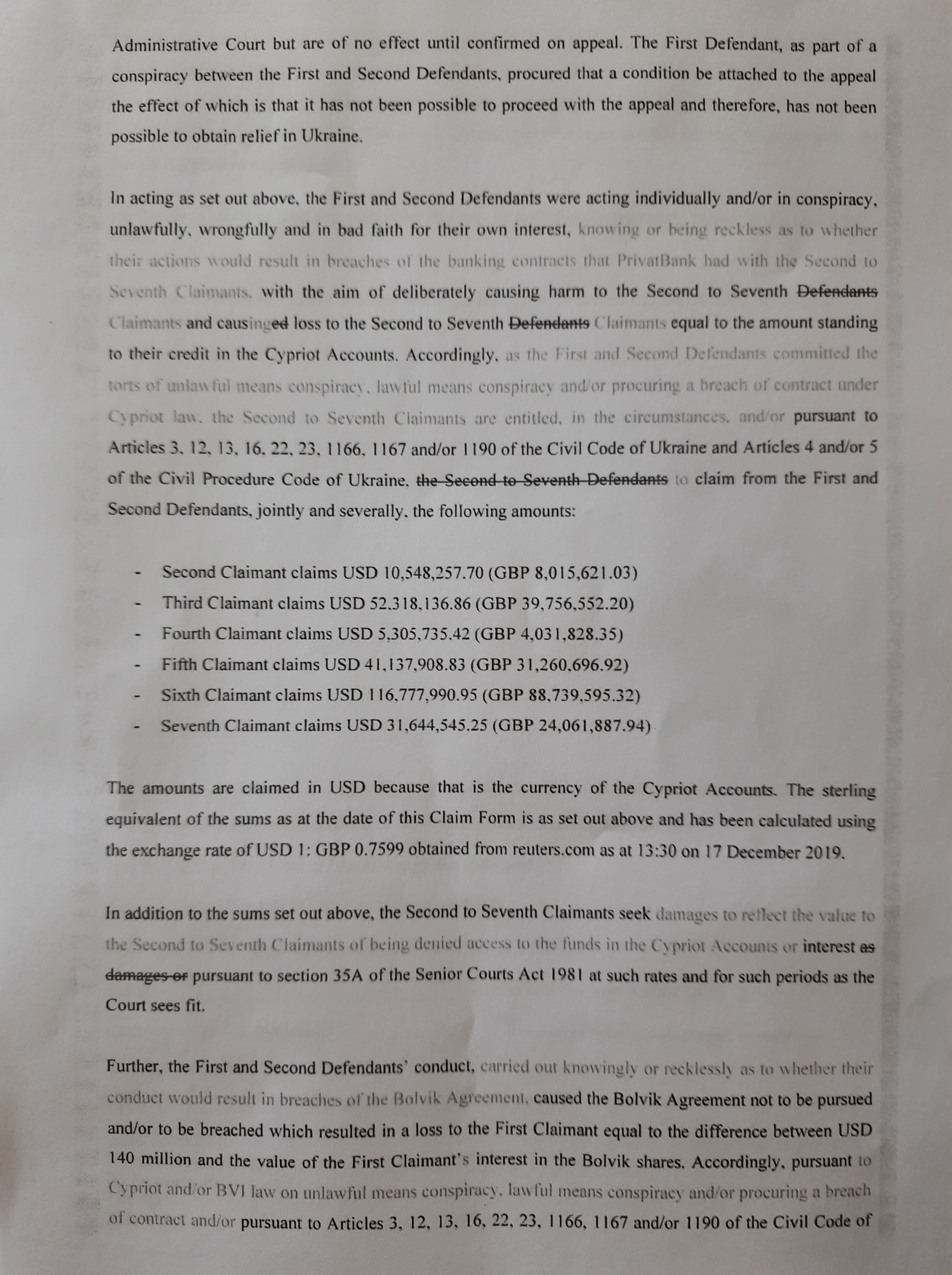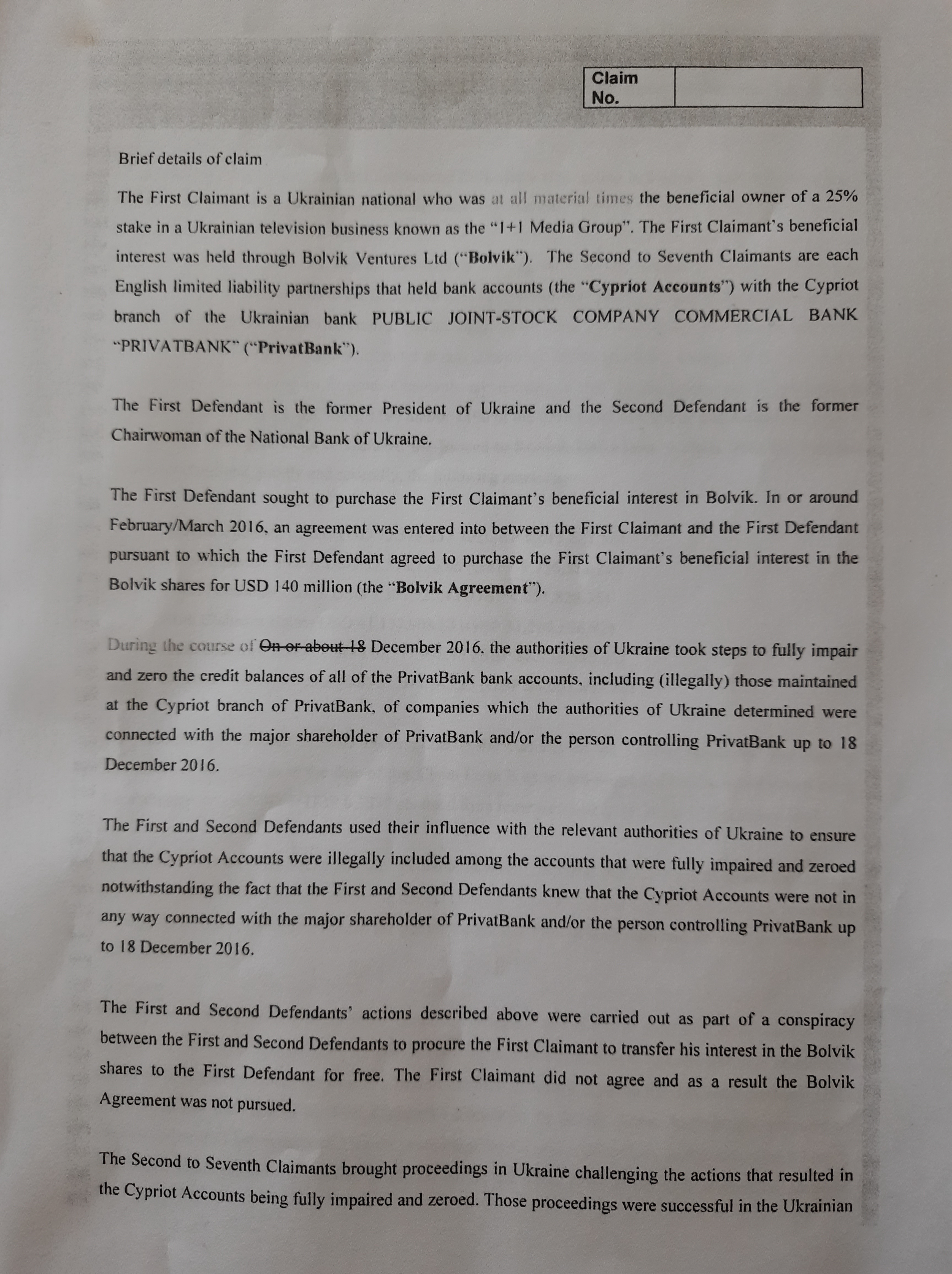 В тексте документа истец утверждает, что национализация Приватбанка была следствием сговора Порошенко и Гонтаревой ради того, чтобы в последствии "обменять" долю Суркиса в телеканале на его же личные средства в кипрском филиале Приватбанка.