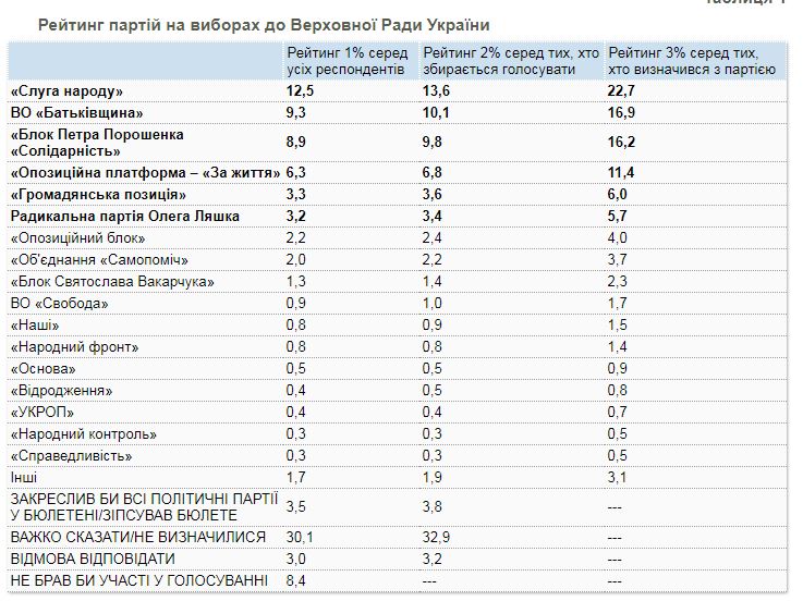 Еще 4% отдали бы голоса за партию "Оппозиционный блок", 3,7% – за партию "Объединение "Самопомощь", 2,3% – за условный "Блок Святослава Вакарчука". Остальные партии и политические силы набирают менее 2%.