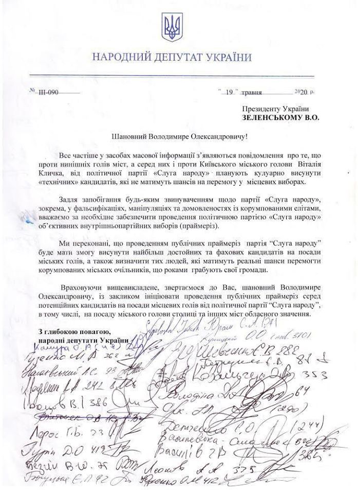 Члены парламентской фракции "Слуга народа" предложили президенту Владимиру Зеленскому провести внутрипартийные праймериз и выбрать на них кандидатов в мэры Киева и областных центров на предстоящих местных выборах. Фотокопию обращения, которое подписал 131 депутат, член президентской фракции Александр Куницкий обнародовал на своей странице в Facebook во вторник, 19 мая.