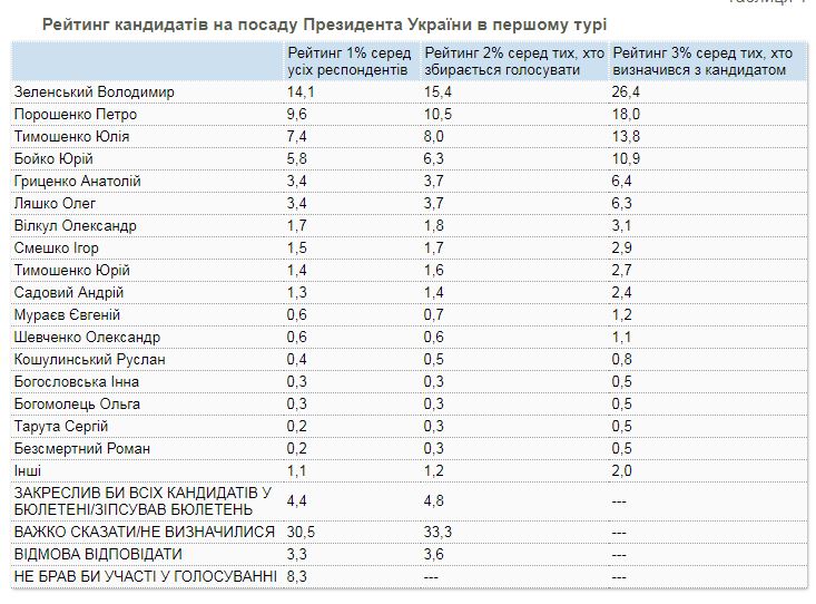 В частности он отметил, что разница в поддержке Петра Порошенко и Юлии Тимошенко в пределах статистической погрешности, что означает, что по этим данным наиболее реальными парами во втором туре были бы В. Зеленский – П. Порошенко или В. Зеленский – Ю. Тимошенко, а также сохраняется высокая вероятность пары П. Порошенко – Ю. Тимошенко.