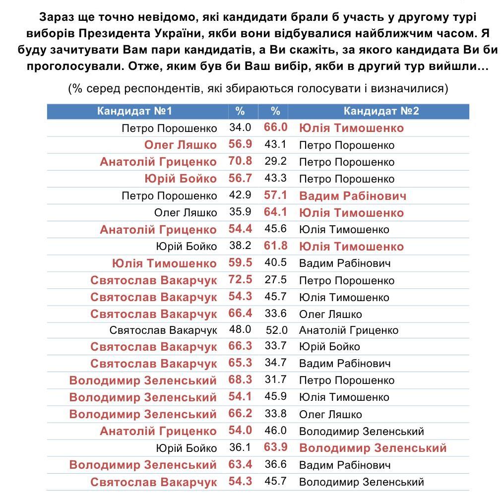 Киевский международный институт социологии в ходе опроса по заказу клиента предложил респондентам 22 пары возможных участников второго тура выборов президента. Результаты свидетельствуют о том, что действующий президент Петр Порошенко проигрывает всем кандидатам, включая Святослава Вакарчука и Владимира Зеленского.