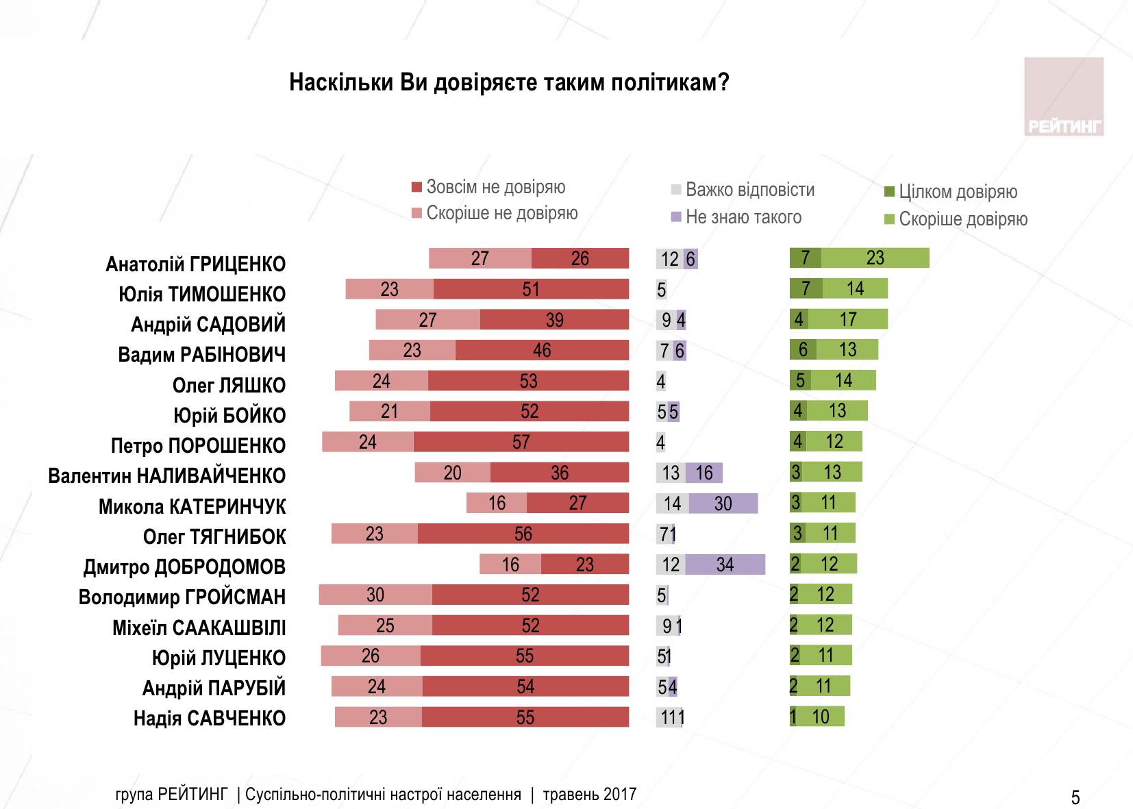 По данным опроса, 30% опрошенных украинцев доверяют Анатолий Гриценко, почти каждый пятый доверяет Юлии Тимошенко, Андрею Садовому, Вадиму Рабиновичу и Олегу Ляшко. По 16-17% доверяют Вадиму Наливайченко, Петру Порошенко, Юрию Бойко, по 13-14% - Олегу Тягнибоку, Владимиру Гройсману, Михеилу Саакашвили, Юрию Луценко, Андрею Парубию. 11% доверяют Надежде Савченко.