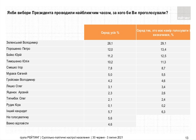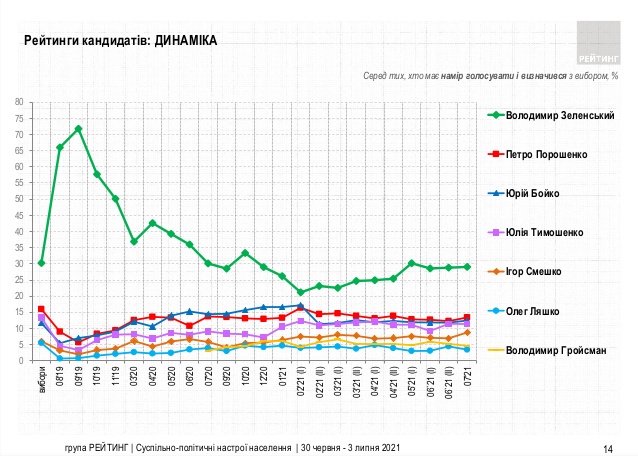Президента Владимира Зеленского поддерживают 29,1% украинцев – столько опрошенных готовы отдать за него голос на выборах, если бы те проводились в ближайшее время (среди тех, кто будет голосовать и определился с выбором), свидетельствуют данные опроса социологической группы «Рейтинг».