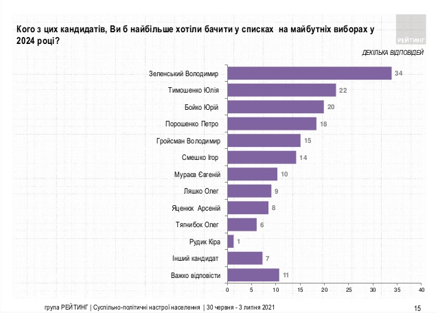 Больше всего опрошенных на предстоящих президентских выборах в 2024 году хотели бы видеть в списках Владимира Зеленского (34%) и Юлию Тимошенко (22%). Юрия Бойко хотели бы видеть в списках 20%, Петра Порошенко – 18%, Владимира Гройсмана – 15%, Игоря Смешко – 14%, 10% – Евгения Мураева.