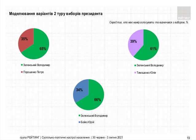 В паре Зеленский-Порошенко результат 65% против 35% (среди тех, кто намерен голосовать и определился с выбором). В паре Зеленский-Тимошенко – 61% против 39%, в паре Зеленский-Бойко – 66% против 34%.