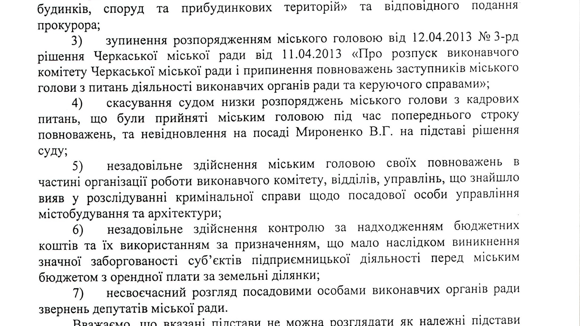 Кроме того, сам опальный мэр Черкасс представил ZN.UA вывод Института государства и права им.Корецкого НАН Украины. Его суть в следующем: "Считаем, что решение Черкассого городского совета от 24.04.2013 №3-1669 "О досрочном прекращении полномочий городского головы Одарича Сергея Олеговича" не отвечает законодательству, поскольку не содержит оснований для досрочного прекращения полномочий городского головы, предусмотренных частью 2 статьи 79 Закона Украины "О местном самоуправлении в Украине" (см. полный текст вывода выше).