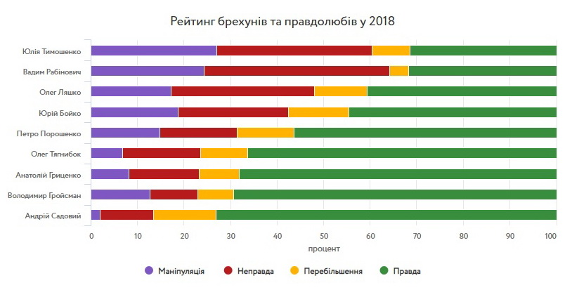 Составители рейтинга отмечают, что высокий уровень правдивости заявлений Гройсмана и Садового обусловлен, в частности, тем, что в 2018 году они преимущественно озвучивали данные официальной статистики в сферах, за которые отвечают.