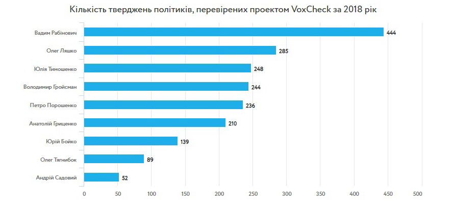 По итогам аналогичного анализа VoxUkraine за 2017 год, Юлия Тимошенко также возглавила антирейтинг по количеству лжи, манипуляций и преувеличений, выявленных в ее риторике. Лишь 10% заявлений лидера "Батькивщины" оказались правдивыми. На втором и третьем месте антирейтинга находились Вадим Рабинович и Юрий Бойко.