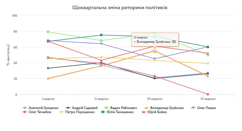 Наиболее честными политиками, по результатам мониторинга их заявлений, оказались кандидаты в президенты Анатолий Гриценко ("Гражданская позиция") и Андрей Садовый ("Самопомич"), а также премьер-министр Владимир Гройсман.